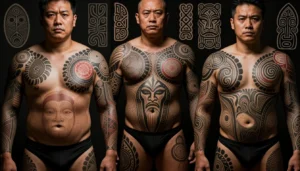 А теперь махнем на Полинезийские острова. Там татуировка – это вообще священное искусство. Какау (в Самоа) или тату (в других частях Полинезии) — это не просто украшение тела, а летопись жизни человека, его семьи и рода. Эти тату наносились вручную с помощью специальных инструментов из зубов акулы, кости и дерева – процесс был болезненным и мог занять недели или даже месяцы.